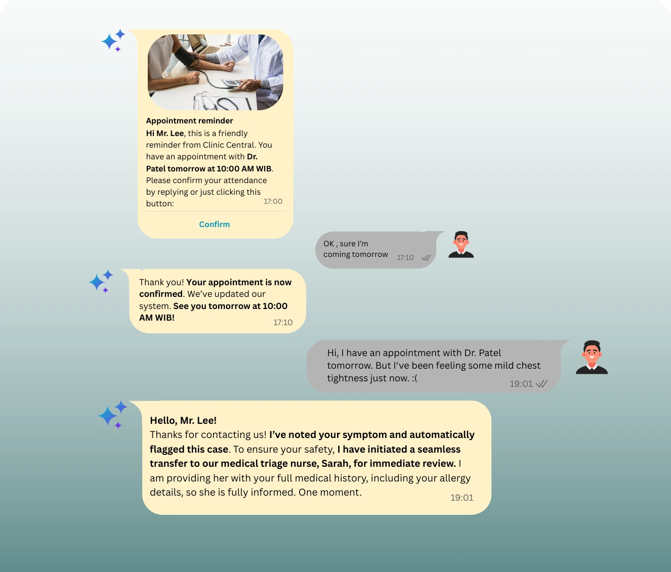 Mimin connects your booking flow, patient reminders, post-visit follow-ups, and broadcast health campaigns in one platform. Receptionists handle exceptions. The AI handles everything else.